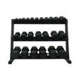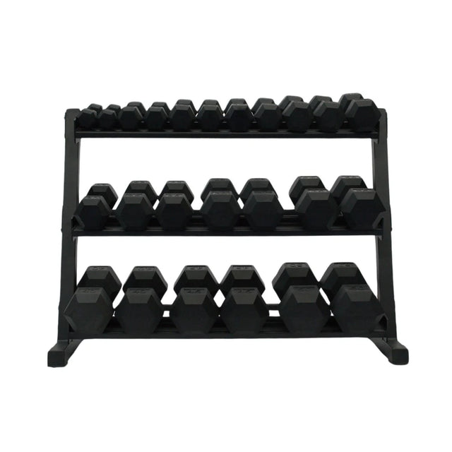 This 3-tier rack holds one (1) pair each of 5-50 lb. hex dumbbells! With the 42.5" extra wide rack space you will have plenty of room on each tier.