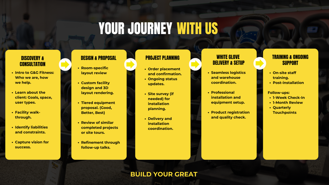 G&G Fitness is committed to helping individuals and businesses build their dream gyms, creating spaces that inspire health and well-being. Driven by our "Build Your Great" motto, we provide top-quality fitness equipment and expert guidance to empower everyone to lead active, fulfilling lives.